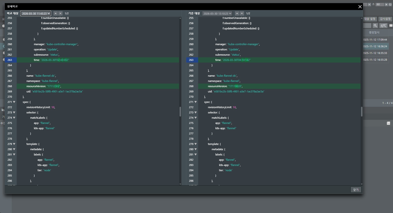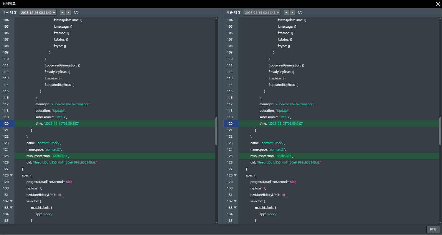 - 상세비교 (Visual Diff): '상세비교' 기능을 실행하면 장애가 없던 과거 시점과 현재의 YAML 데이터를 나란히 대조합니다. 변경된 코드 라인이 하이라이트 처리되어 나타나므로, 운영자는 화살표를 눌러가며 이미지 태그가 바뀌었는지, 혹은 누군가 실수로 환경 변수를 삭제했는지 단 몇 초 만에 찾아낼 수 있습니다.