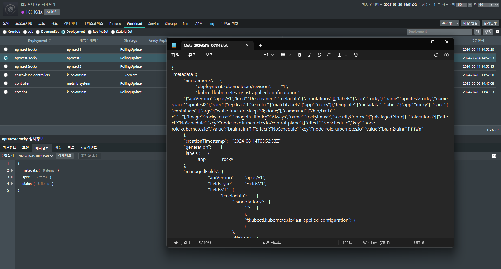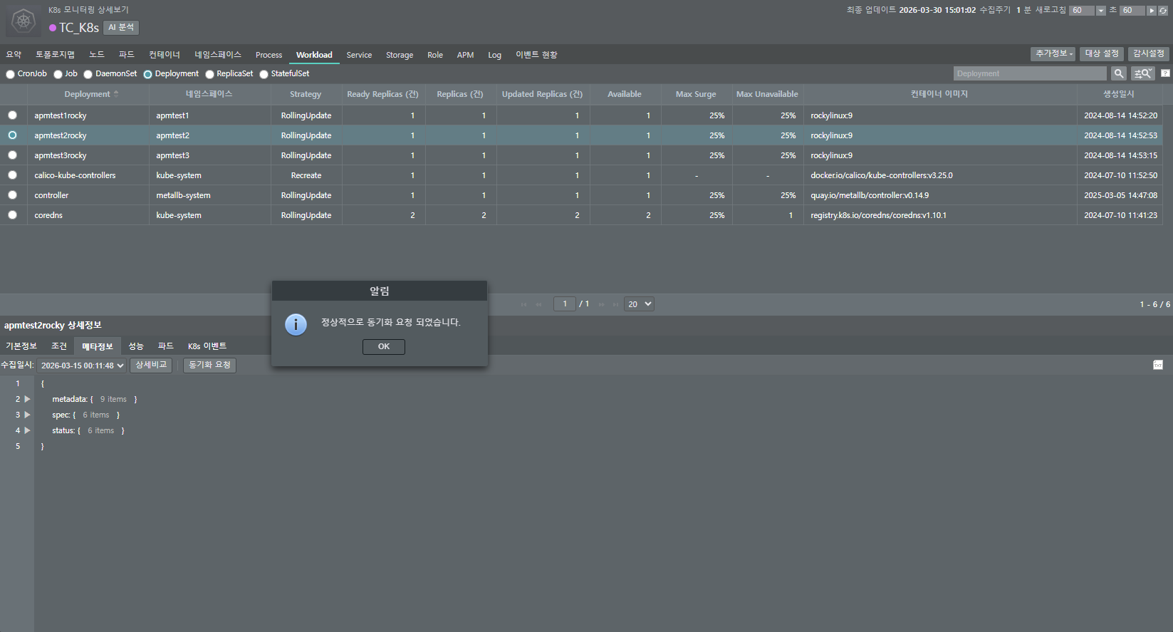 - 메타 정보: Metadata, Spec, Status 등 상세 설계를 확인하는 곳입니다. 수동 동기화를 통해 정보를 실시간으로 누적할 수 있으며, 이렇게 쌓인 데이터는 나중에 변경 이력을 분석하여 장애 원인을 찾는 소중한 단서가 됩니다.