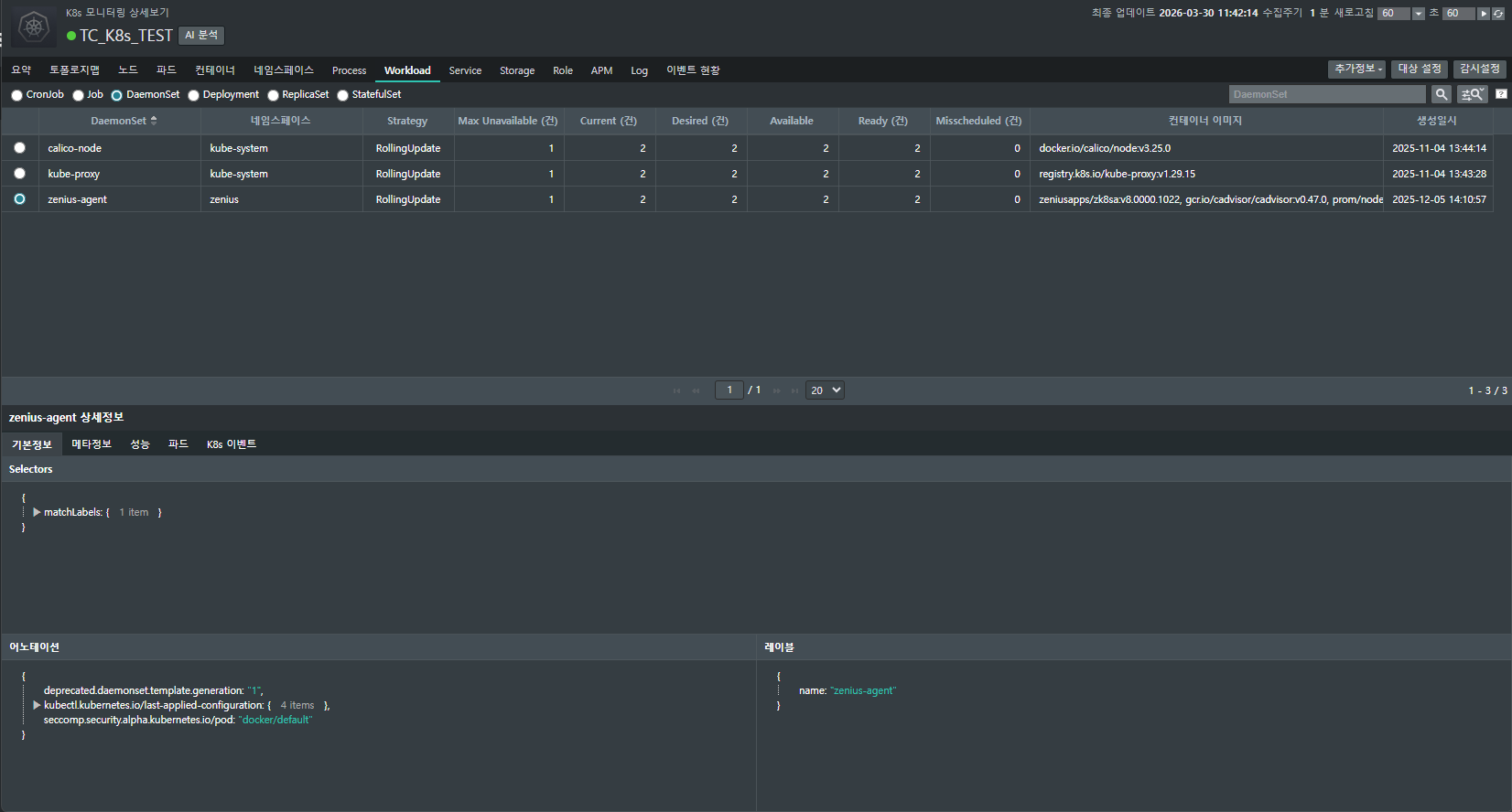 장애 대응의 시작은 현재 운영 중인 워커노드의 상세 구성을 정확히 파악하는 것입니다. Zenius K8s는 복잡한 YAML 설정을 일일이 분석하지 않아도 GUI 환경에서 모든 정보를 직관적으로 확인할 수 있게 구성되어 있습니다. 쿠버네티스 운영의 핵심인 데몬셋과 디플로이먼트의 상태를 점검하고, 문제가 발생했을 때 원인을 추적하는 과정을 살펴보겠습니다.