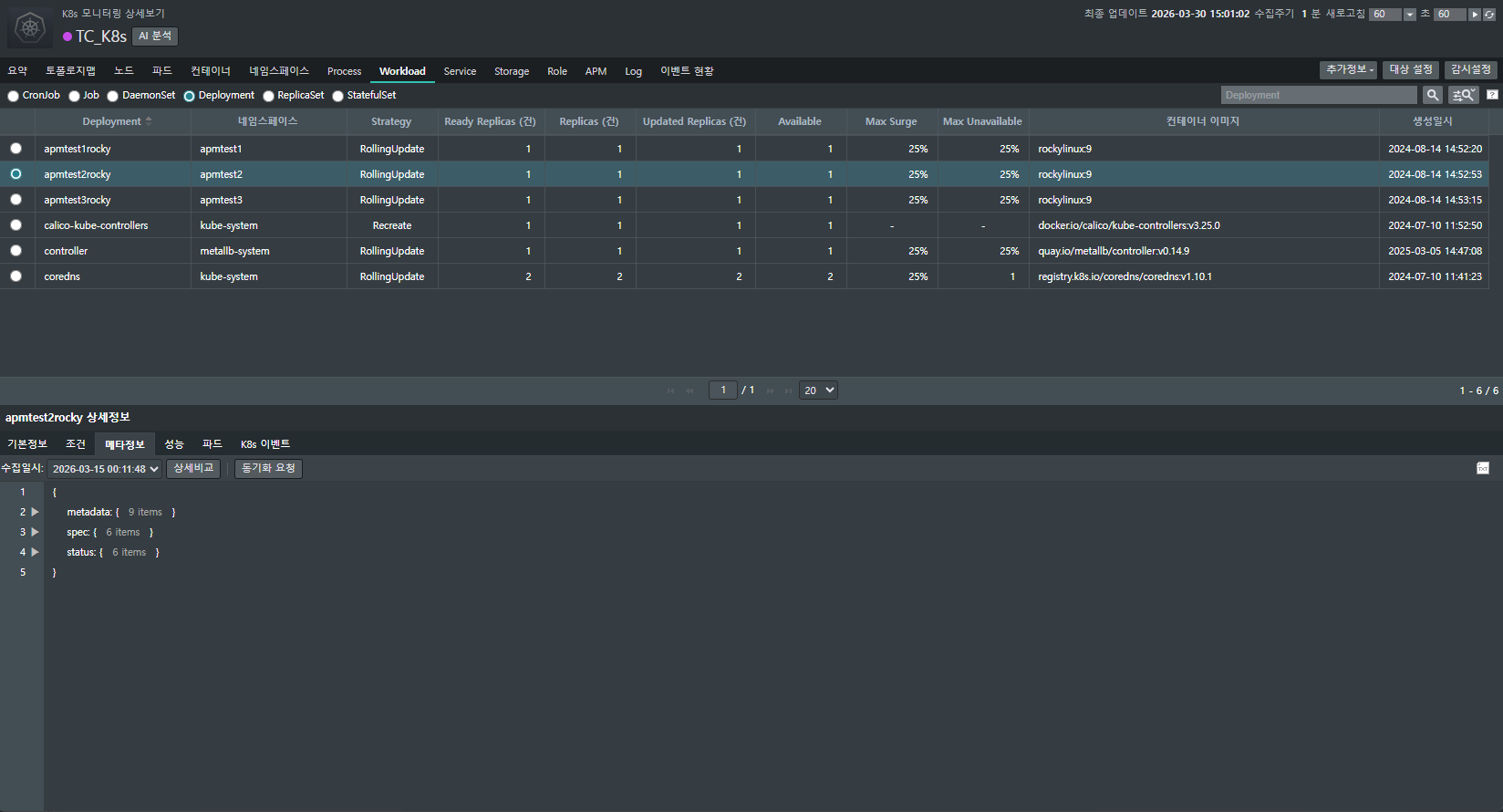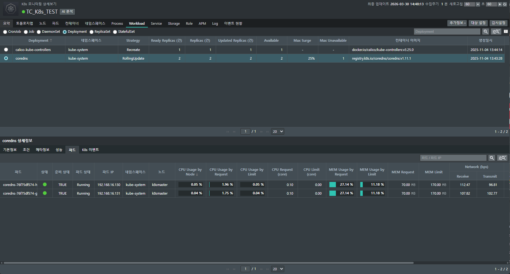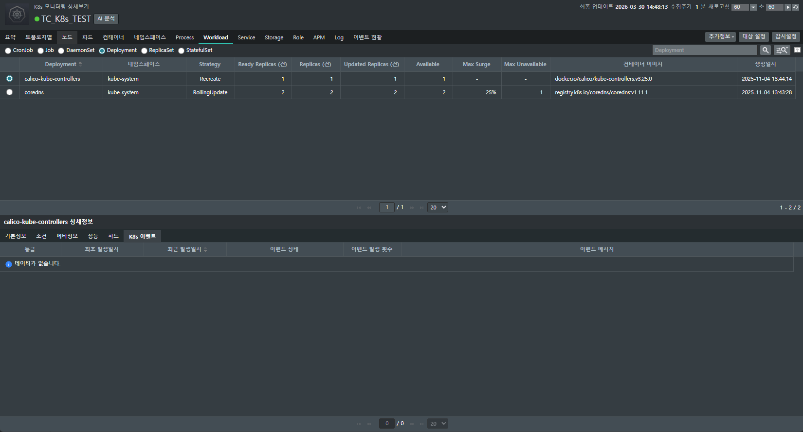 [EMS > K8s > 모니터링 > 요약 > 특정 클러스터 클릭 > Workload > Deployment]