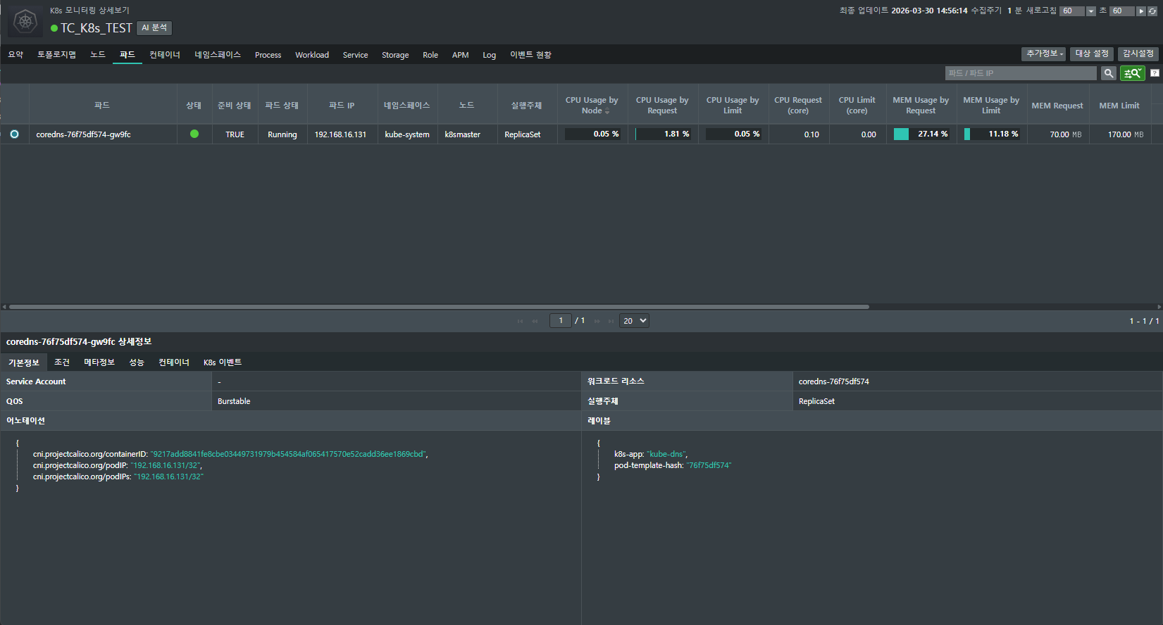 - 상세 분석: 지표에서 이상 징후가 발견되면 망설이지 말고 파드 명칭을 클릭하세요. 자원 사용량의 추이와 시스템 로그를 심층 분석할 수 있는 화면으로 즉시 연결되어 원인 파악의 속도를 높여줍니다.