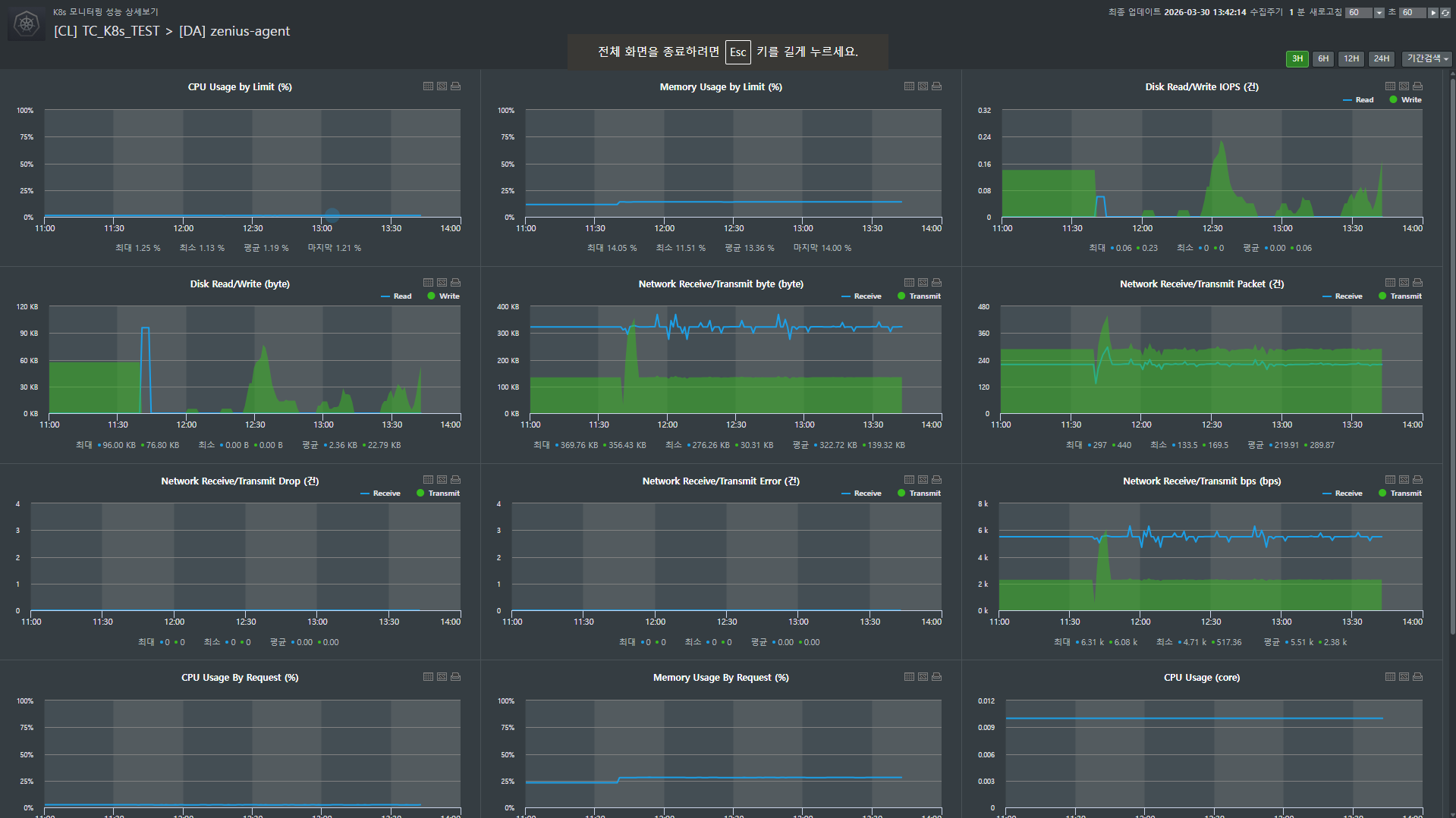 - 리소스 한도 대비 사용률(CPU/MEM Usage by Limit): 쿠버네티스 장애의 단골 손님인 'OOM(Out Of Memory) Kill'을 예방하는 지표입니다. 설정된 제한값(Limit) 근처에서 자원이 요동치고 있다면, 더 큰 장애가 터지기 전에 리소스 증설이나 코드 최적화 타이밍을 잡아야 합니다.
