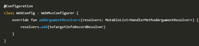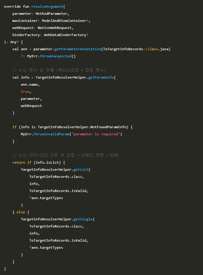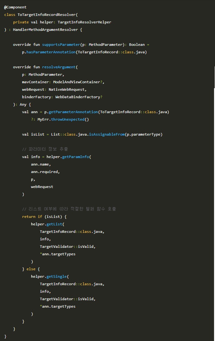 다음으로 Spring MVC의 HandlerMethodArgumentResolver 인터페이스를 구현하여 실질적인 바인딩 로직을 처리하는 ToTargetInfoRecordResolver를 작성합니다.